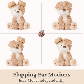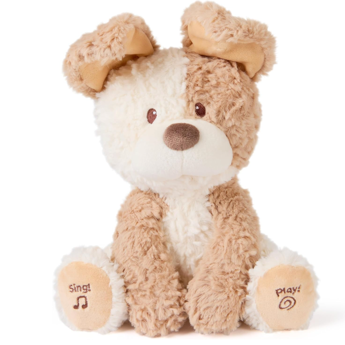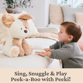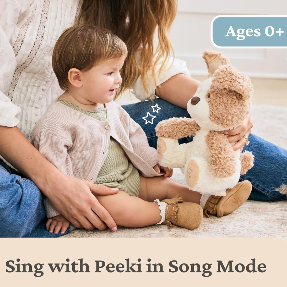- SINGING PUPPY: Peeki is a cute seated puppy that uses music and movement to stimulate baby’s senses and encourage tactile play. This 12” stuffed animal has soft plush, embroidered details, and makes interactive play fun as it “talks” to little ones