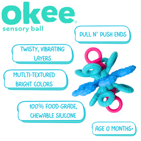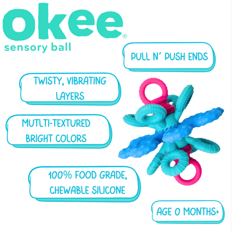 Twist, squish, pull, pop, and chew! OKEE® Activity Ball is a dynamic playtime companion that is packed with exciting textures and endless play. By providing both stimulating and soothing actions, OKEE® offers a unique blend of fun and educational value, promoting concentration, coordination, and sensory exploration. Little fingers can’t resist OKEE®'s: