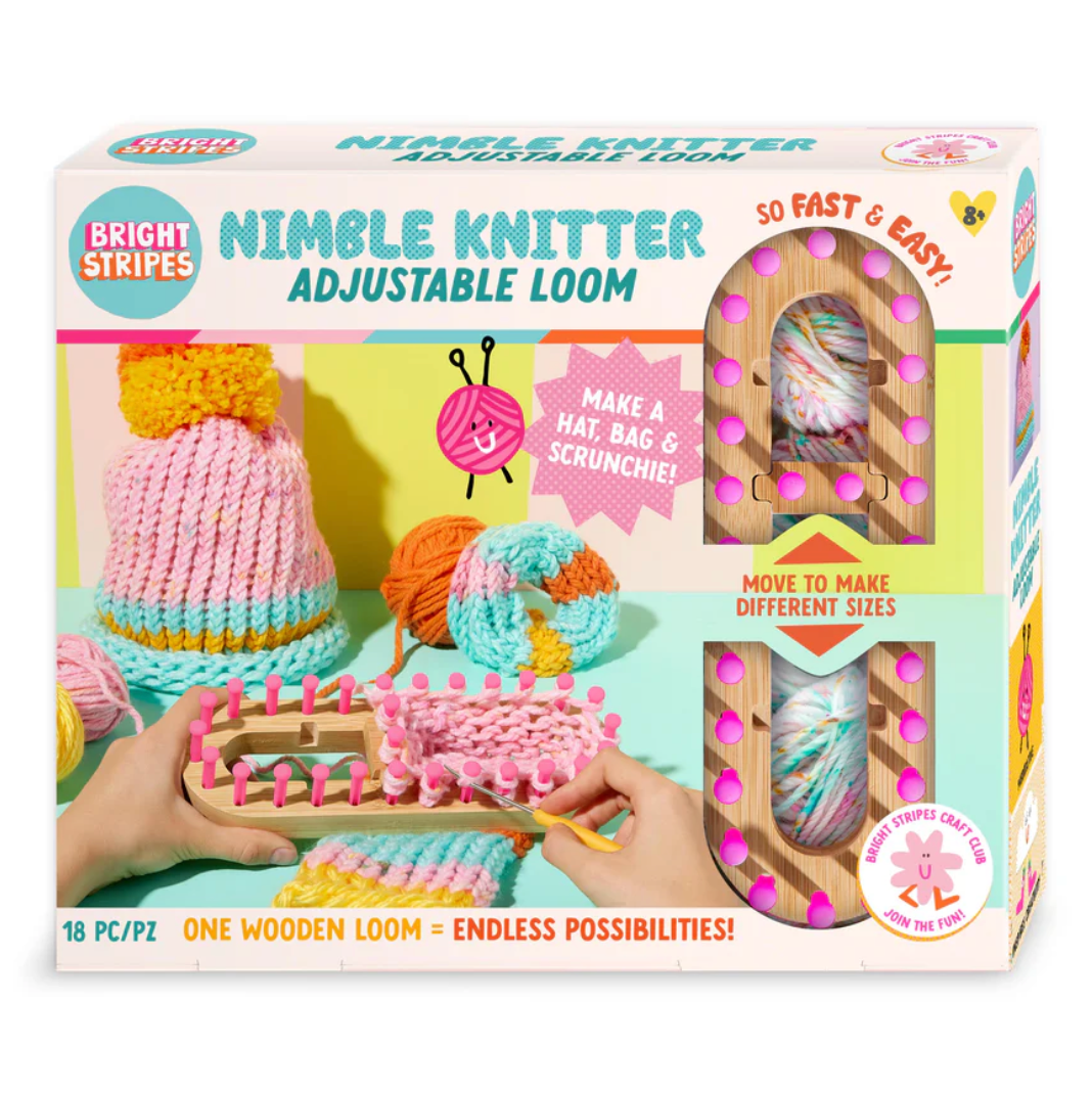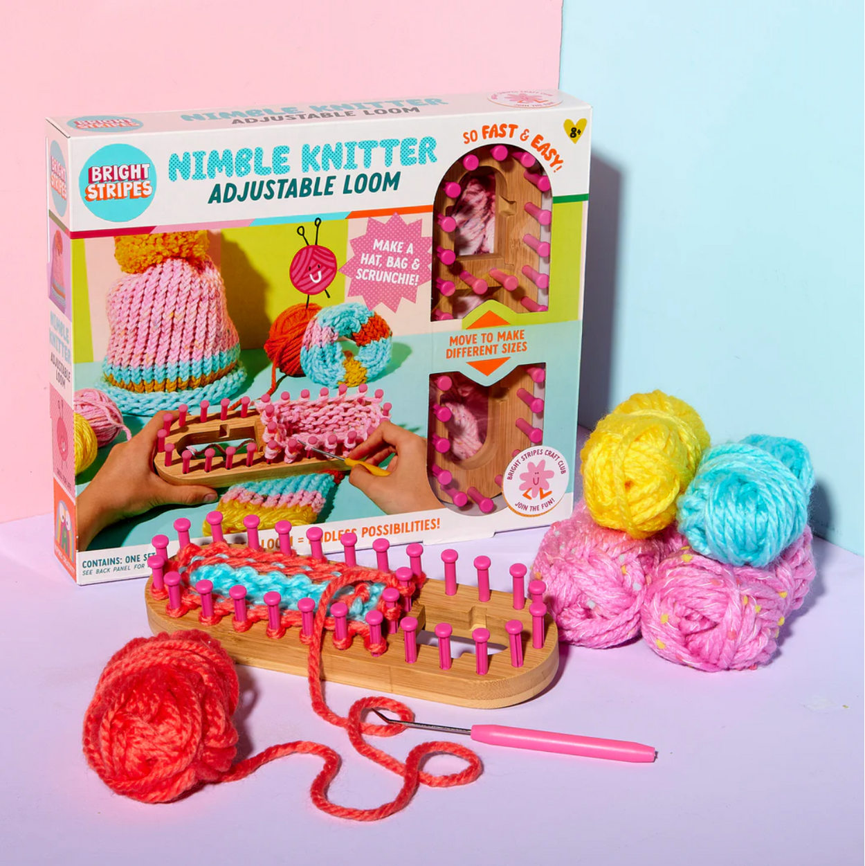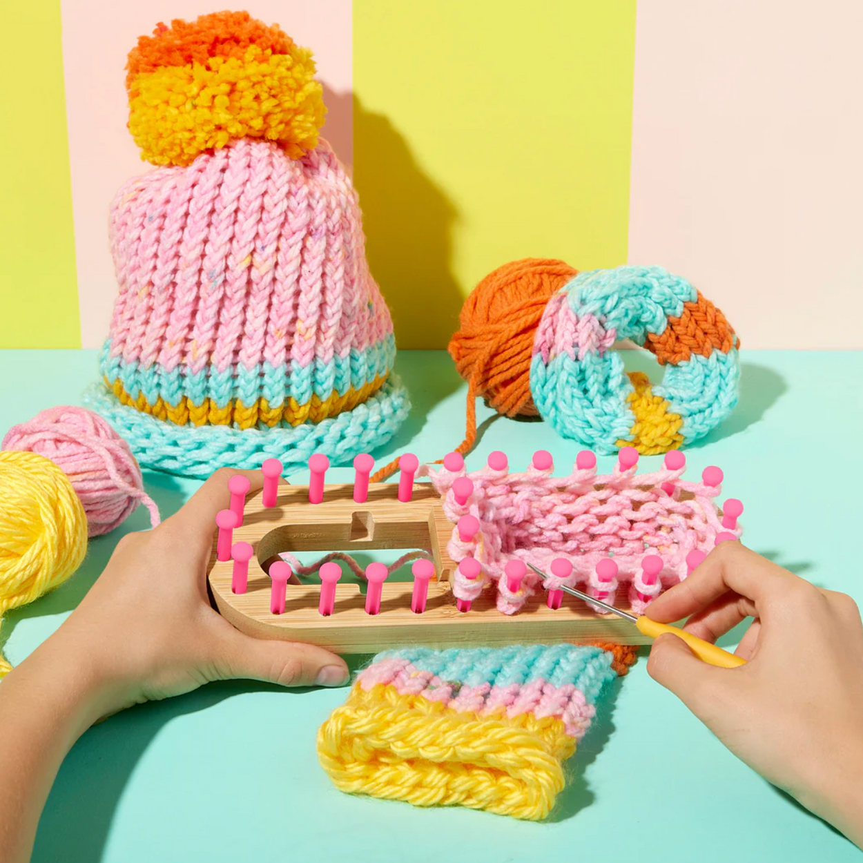 It's so easy to knit a hat, bag, and scrunchie with the adjustable bamboo knitting loom. Just place the puzzle piece into the loom to change the width 4 sizes in one! The chunky yarn knits up quick, in beautiful flecked pink and bright pastel tones. Great for beginning knitters. Includes a Craft Club bonus door sign to let people know that you're busy crafting! The easy-to-follow instruction guide will get you knitting in no time!