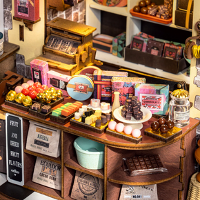 Step inside and discover an irresistible display of chocolate truffles, rich bars, pralines, and more, all crafted in adorable miniature form. Shelves are stocked with decadent treats, delicate packaging, and charming shop décor-capturing the cozy, luxurious feel of a true artisan chocolate shop.