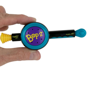 - THE CLASSIC GAME OF BOP IT, TWIST IT, PULL IT: in a size that fits in the palm of your hand! Measures only 5 x 2.25 inches and really works! Display stand included