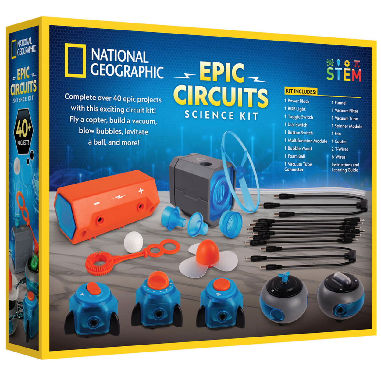 The National Geographic Epic Snap Circuits Science Kit features 36 circuit-building projects that involve connecting switches, modules, lights, and more to a power block with various cables. These are great activities for getting acquainted with negative vs positive ports and understanding how circuit-powered items operate. There are 7 additional activities available in the back of the instruction booklet. Requires 3 AAA batteries. Batteries not included.