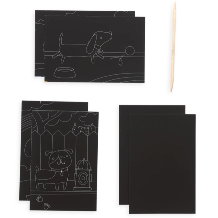 Get busy scratching because these cute dogs are waiting! These pup themed scratch art cards are filled with easy-to-follow guidelines to reveal the canine inspired rainbow artwork. Sized for on-the-go fun at 4 x 6 inches these mini scratch art kits for kids are great for travel. Each kit not only has 4 cute dog illustrated cards but 2 blank cards for creating your own designs, all revealing a rainbow of color using the included wooden stylus.