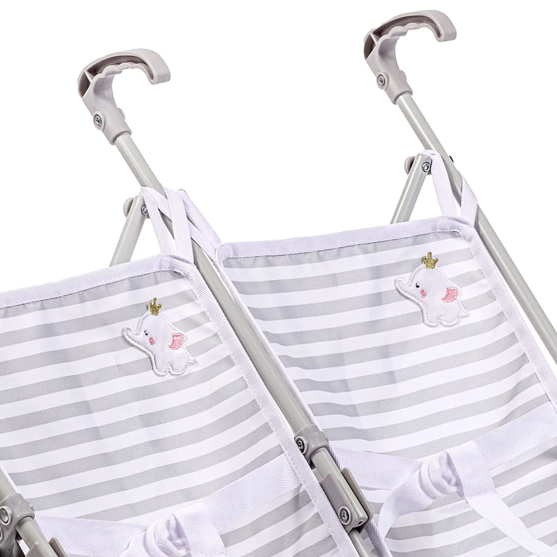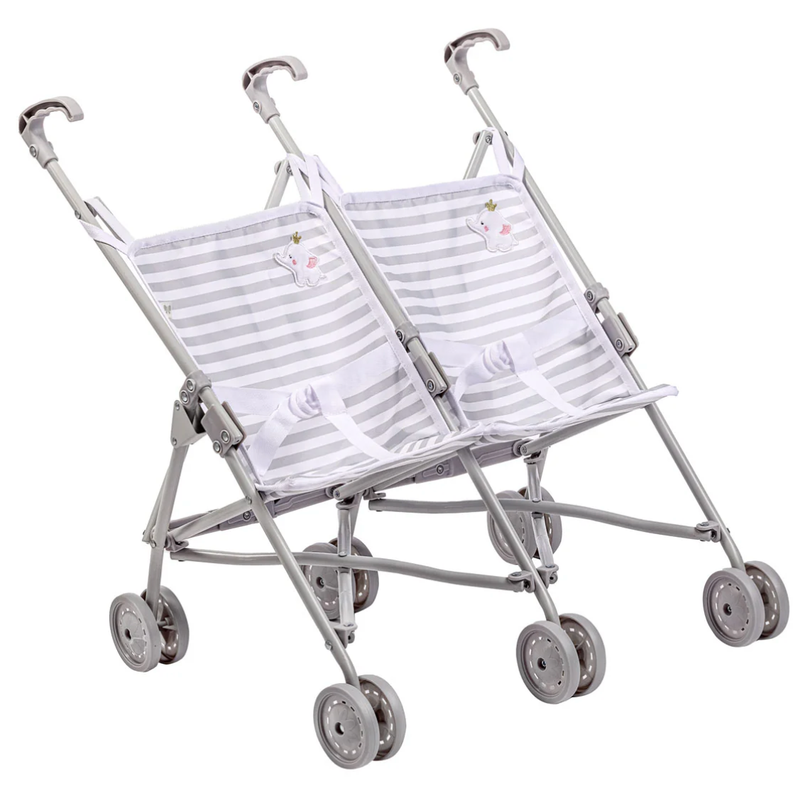 - TWIN GREY FOLDING SINGLE STROLLER // Elegantly Designed with Grey Frame and Grey and White Striped Seats that include embroidered Boutique Accents and doll strap