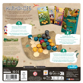 In Harmonies, you will create beautiful landscapes by placing colored tiles. These tiles will create territories for animals and will bring them in to settle in your tiny world! Tactically combine your landscapes and animals to earn the most victory points and win the game.