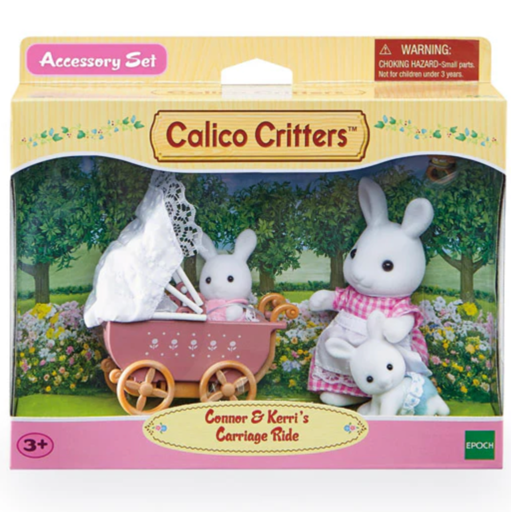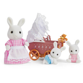 Old-fashioned pram with two rabbit twins and mother rabbit.