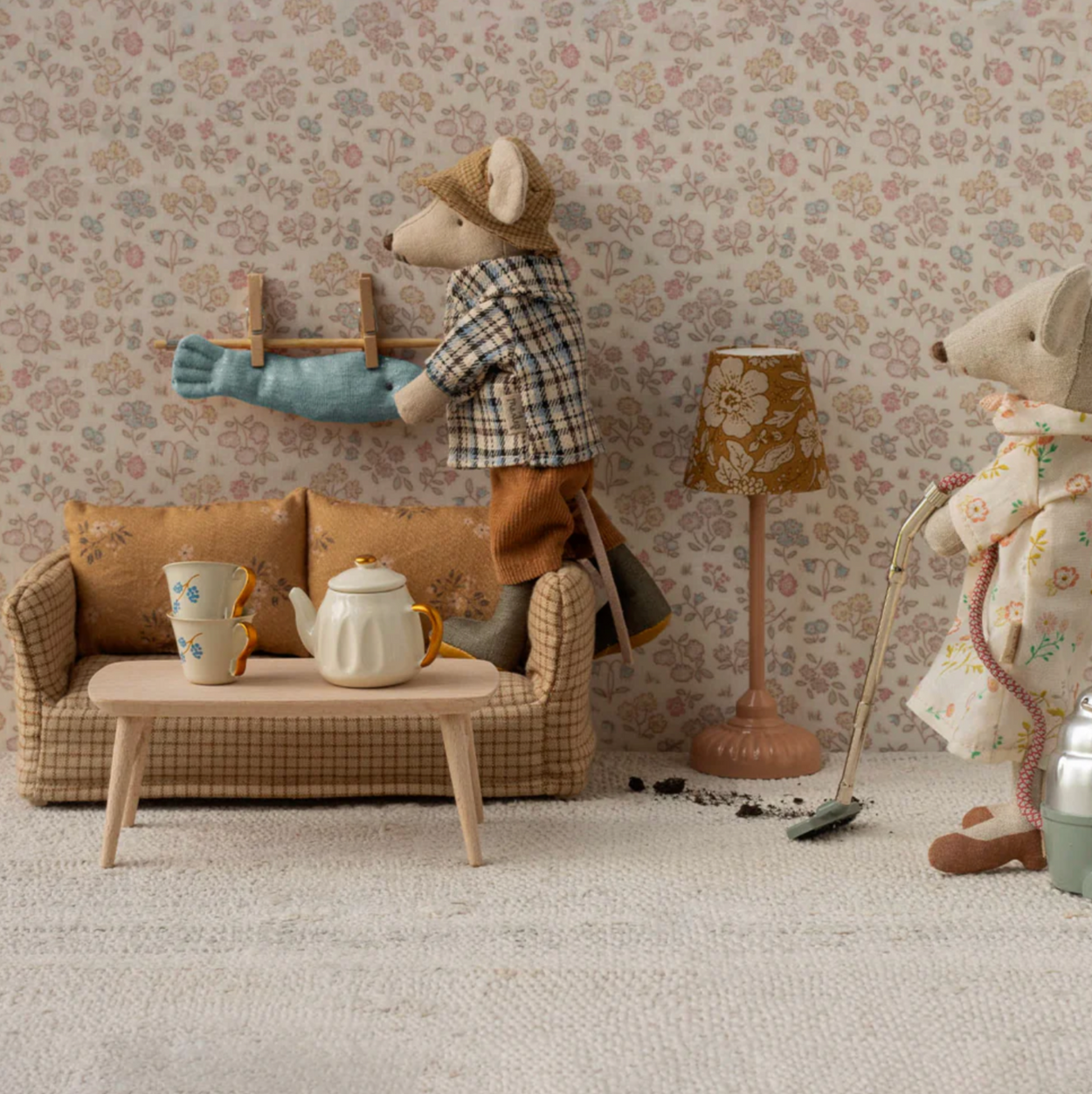 All families needs a soft couch to rest in. The mice family can all sit tight in this and have a cosy time, it fits perfectly to the living room in the Mouse hole Farmhouse. Add the wooden coffee table to fulfill your home decoration.