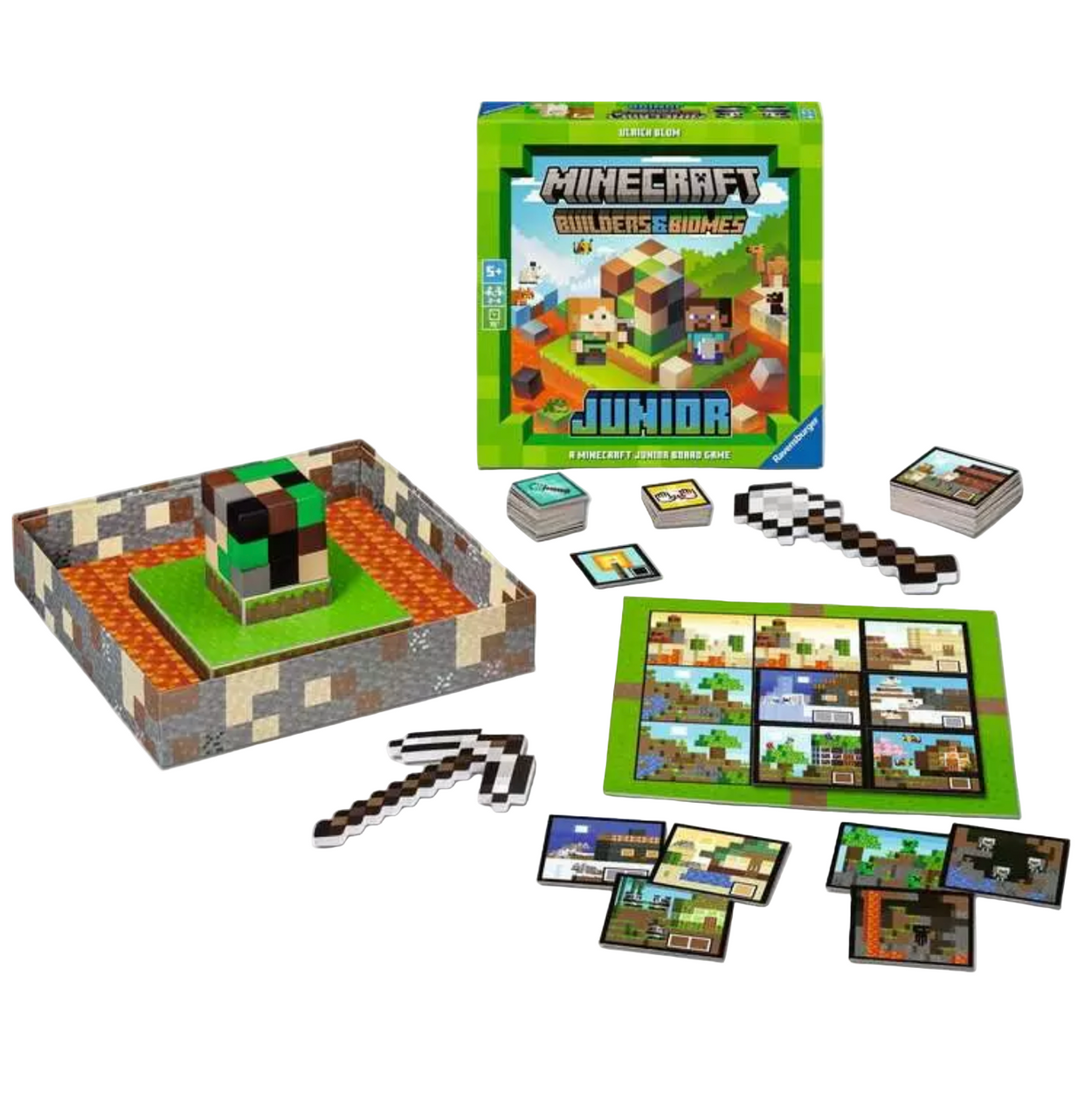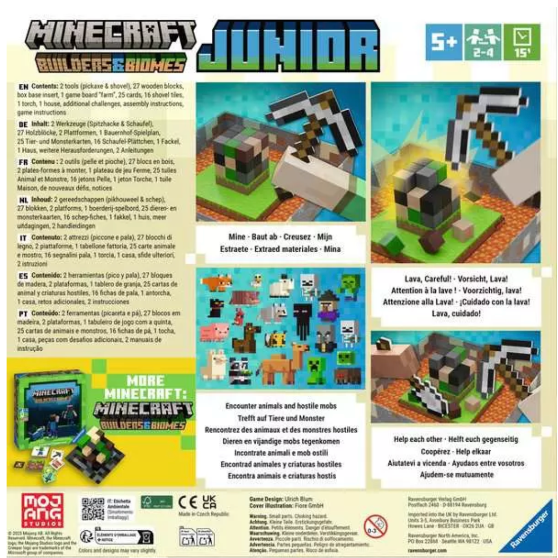 In the cooperative Minecraft Builders & Biomes Junior Game, players take turns to reveal creatures, in hope that they turn over animals to add to their farms rather than enemies such as zombies. Players can mine materials from the resource pile using the cardboard shovel and pickaxe to build onto their farm, but must be careful not to let any resource fall into the lava, as this will eliminate the fallen resource from the game. The goal is to effectively build and protect your farm to completion before the enemies overtake it! Also included are additional challenges. For 2-4 players, with 15 minutes of playing time.