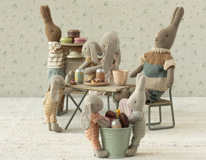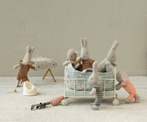 This sweet bunny in micro size is dressed in a striped suit knitted in a soft linen/cotton blend. It fits all the micro size furniture and will surely lead to many hours of play! The knitted suit is made in 3 lovely color combinations.