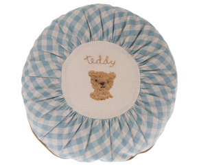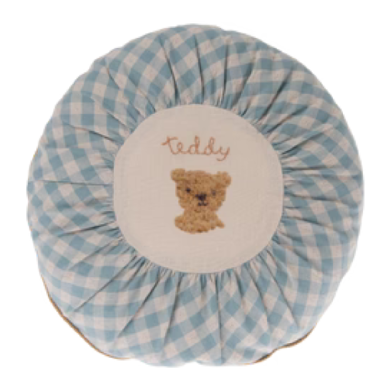 This round soft cushion adds comfort and charm to your room. The playful fabric is finished with a delicate, embroidered Teddy face on the front. The pillow is perfect for creating a cosy corner or adding a decorative touch to your home decor.