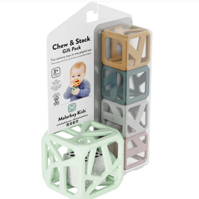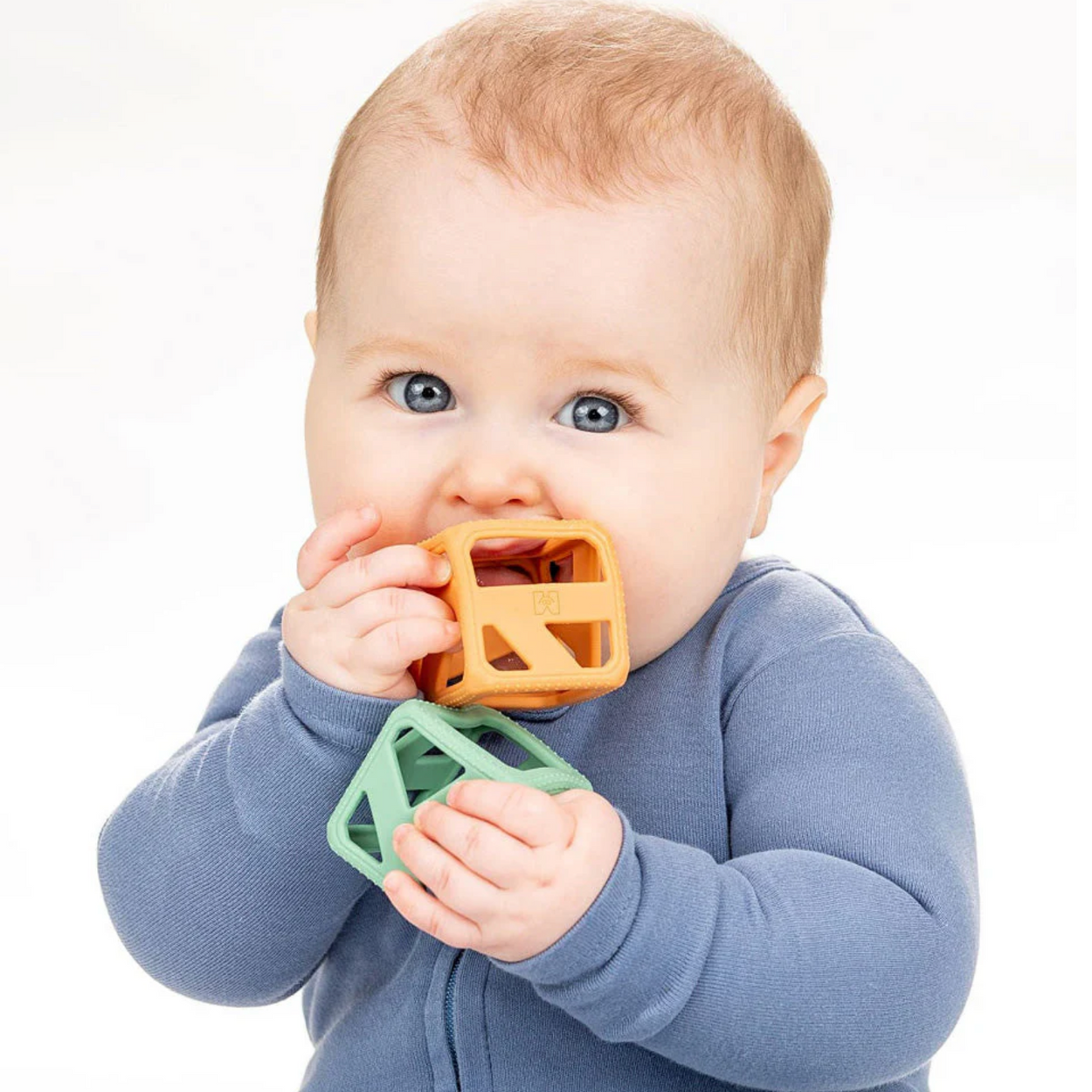 Designed with love by a mom, this Stack N Chew Mini Cubes and Chew Cube bundle is the perfect present for babies and makes teething time easier for new parents! A chic rattle and teether combo, the Chew Cube has soft, textured edges that soothe gums. Large flexible holes promote early gripping skills while baby is entertained with a gentle rattle! The four Stack N Chew Mini Cubes are also made of textured food-grade silicone, making them safe to teethe on and easy to stack. The contrasting colors stimulate hand-eye coordination and promote early fine motor skills.