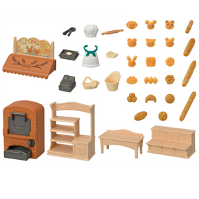 This bakery shop is specifically designed to be used with the Red Roof Cozy Cottage. It features 53 pieces of furniture and accessories for baking, including a baker's outfit for any child size Critter.