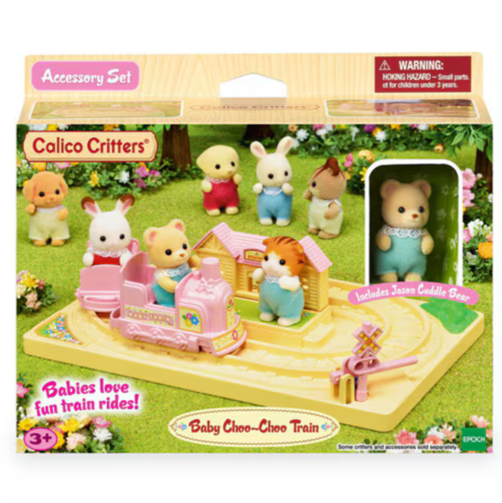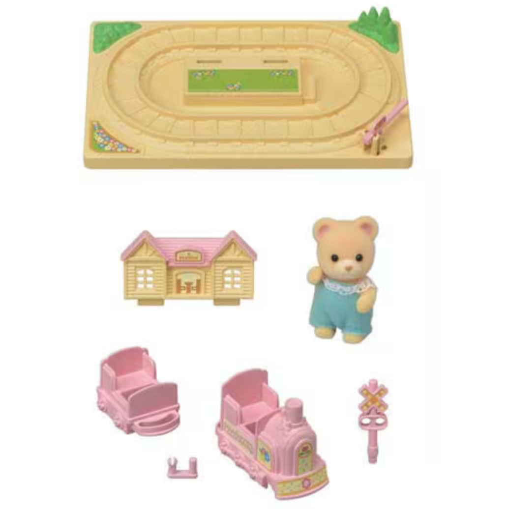 All aboard! Calico Critter babies love to go on train rides! The two train cars can be pushed along the tracks by hand. One baby figure can fit in each train car. Playset includes station, railway, train, passenger cart, connector, crossing gate, crossing signal and Jason Cuddle Bear Baby figure.