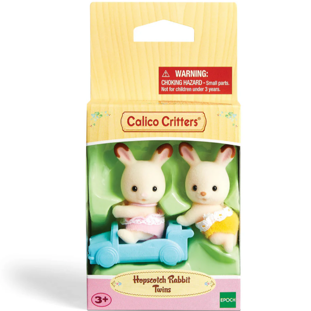 The Hopscotch Rabbit Twins set includes the Hopscotch Rabbit twins figures (one sitting and one crawling) and a ride-on toy. The figures can be posed by moving the head. Hopscotch Rabbit Twins' heads can turn. Hopscotch Rabbit Twin (sitting) can fit inside the ride-on toy. Put Hopscotch Rabbit Twin's (crawling) hand on the ride-on toy to act out pushing it. The crawling Hopscotch Rabbit Twin is a baby boy. He's curious about everything and will crawl absolutely everywhere.