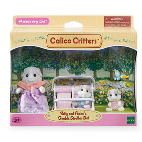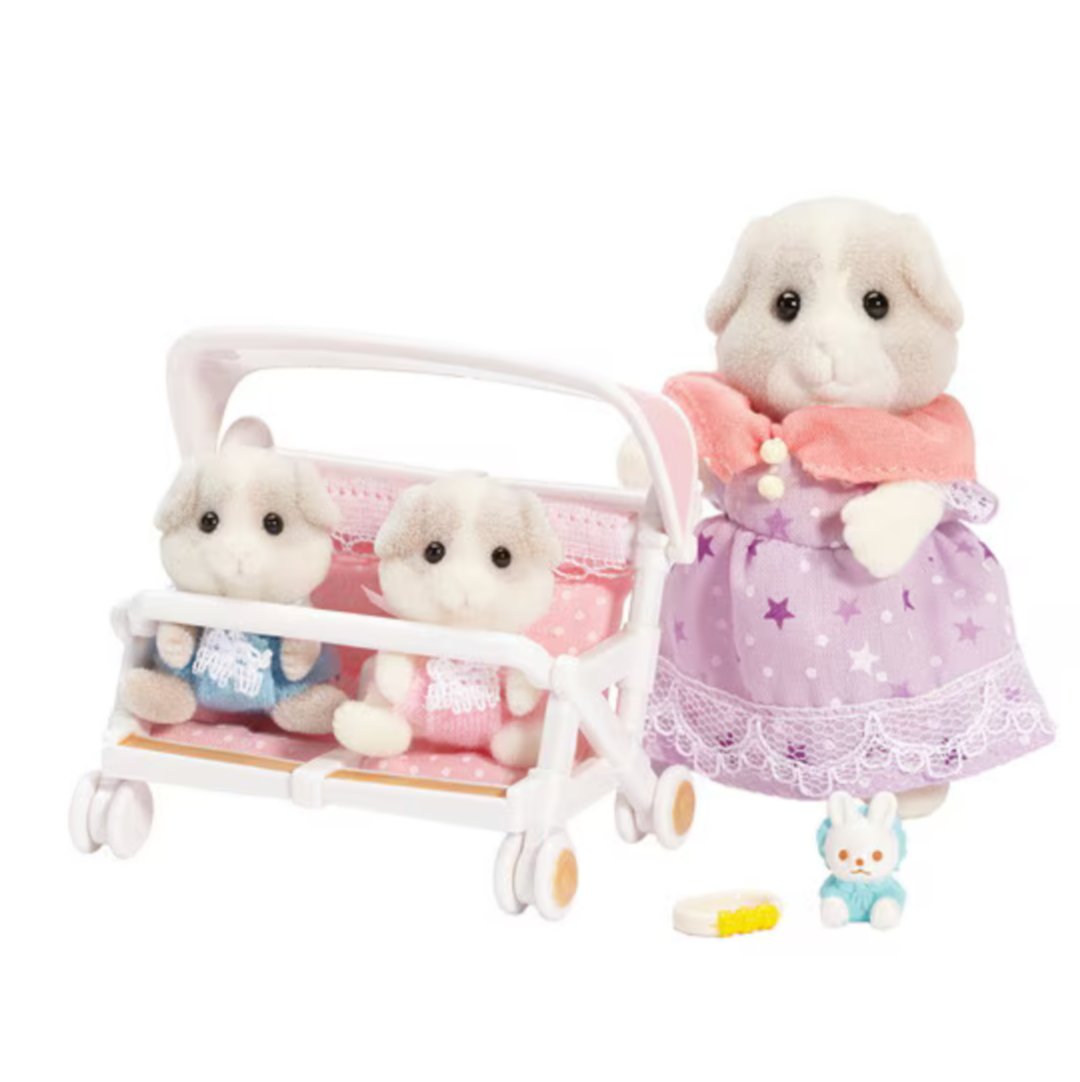 Includes: Mother Guinea Pig Penny, Twins Patty and Paden, double stroller with rotating wheels and adjustable canopy cover, baby ring toy & bunny toy.