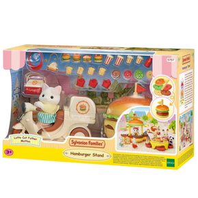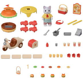 Comes with over 30 accessories including cute hamburgers with cat ear-shaped buns and drinks.The hamburger stand can be set up in two ways―shop mode and transport mode. The hamburger stand can be attached to the delivery bike and driven around.The Latte Cat father, the owner of the hamburger stand, delivers delicious hamburgers to all the villagers. He is wearing a special hamburger shop uniform that is only available with this set.
