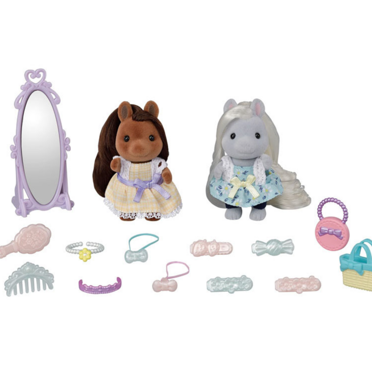 ・The Pretty Ponies set includes two Pony girls with silky hair, a stylish standing mirror, hair accessories, and fashion accessories.