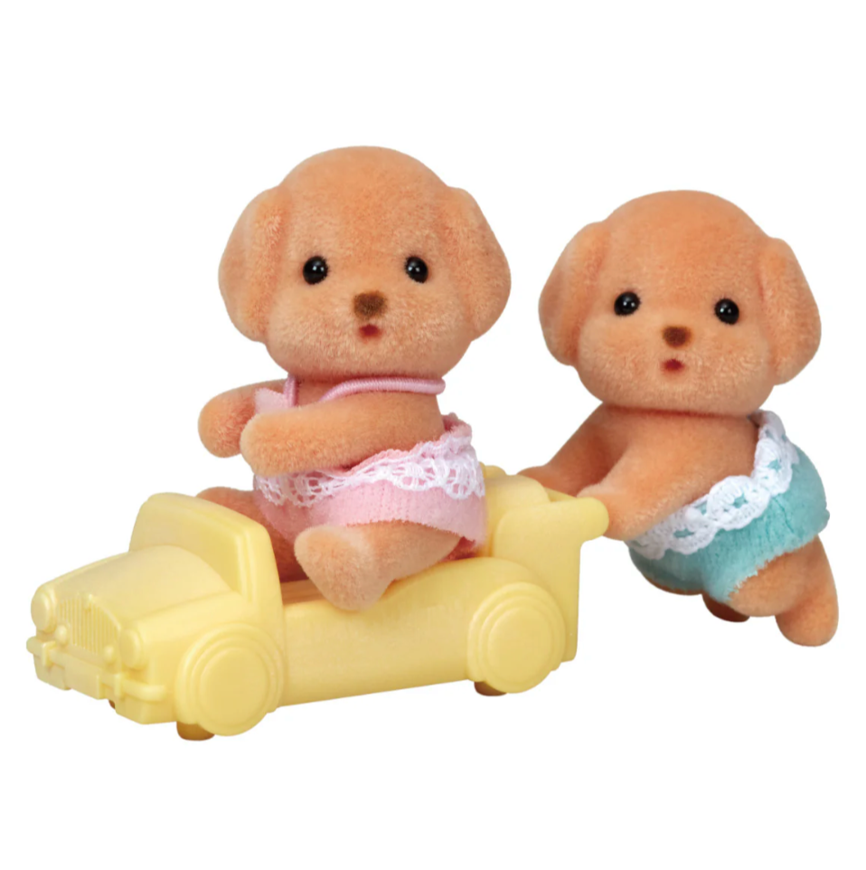 The Toy Poodle Twins set includes Twin Girl Mia and Twin Boy Max. The crawling Toy Poodle Twin is baby boy, Max. He isn't picky with his food and doesn't play pranks, but loves to move around oh so much! The sitting Toy Poodle Twin is baby girl, Mia. She quickly adapts to new places, and is as happy playing with family as newly-met people.