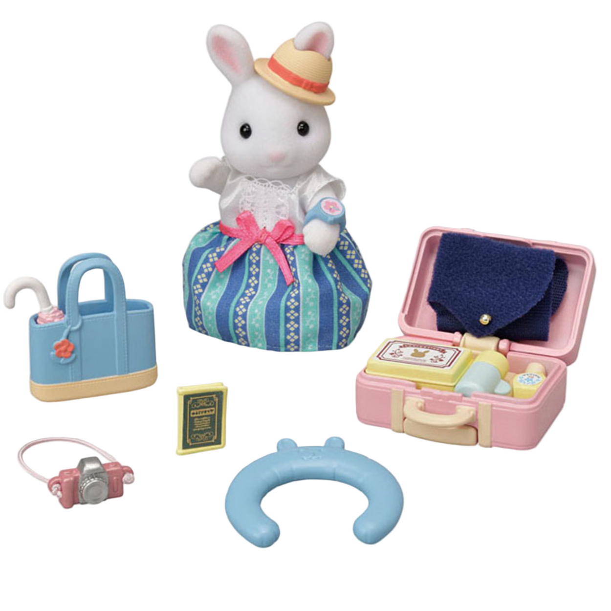 - Accessories include rolling suitcase, tote bag with parasol, neck pillow, camera, hat and sweater, watch and more!