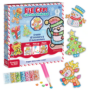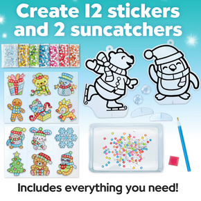 Diamond Painting made simple for kids! Get into the holiday spirit by completing two diamond painting activities with one craft kit. Create 12 stickers and two sun catchers offer an open-ended design experience. Apply your diamond painted stickers to ornaments, gift tags, homemade cards and so much more!