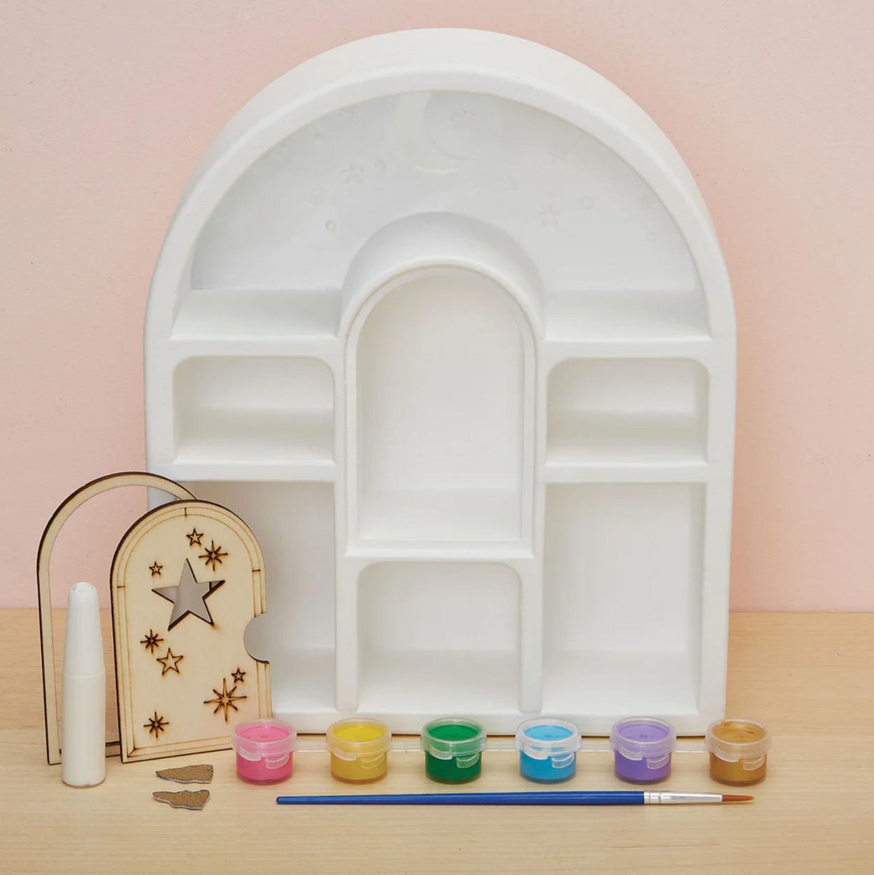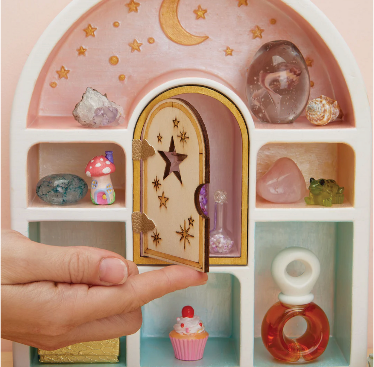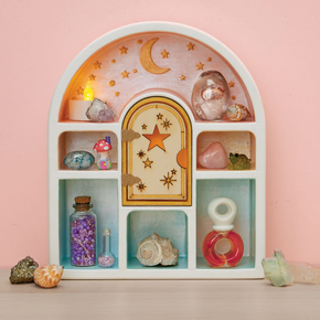 Everyone love miniatures, and this high-quality plaster curio shelf lets you show off all your precious things! Paint with the pearlized pastel paints and metallic gold, then add the laser-etched fairy door. The tallest spaces fit standard 3" collectibles.