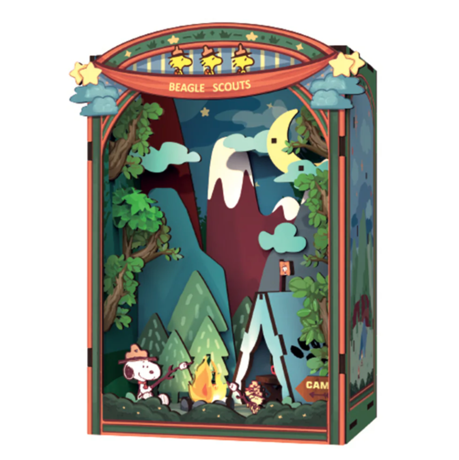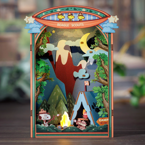 Gather 'round the campfire with Snoopy and his loyal Beagle Scouts in this heartwarming DIY Miniature Book Nook Kit! Nestled between trees and under the stars, Snoopy and the Woodstocks are toasting marshmallows over a crackling fire, their cozy tent pitched nearby. In the distance, gentle mountain silhouettes rise beyond the forest-setting the perfect scene for a peaceful, storybook escape.
