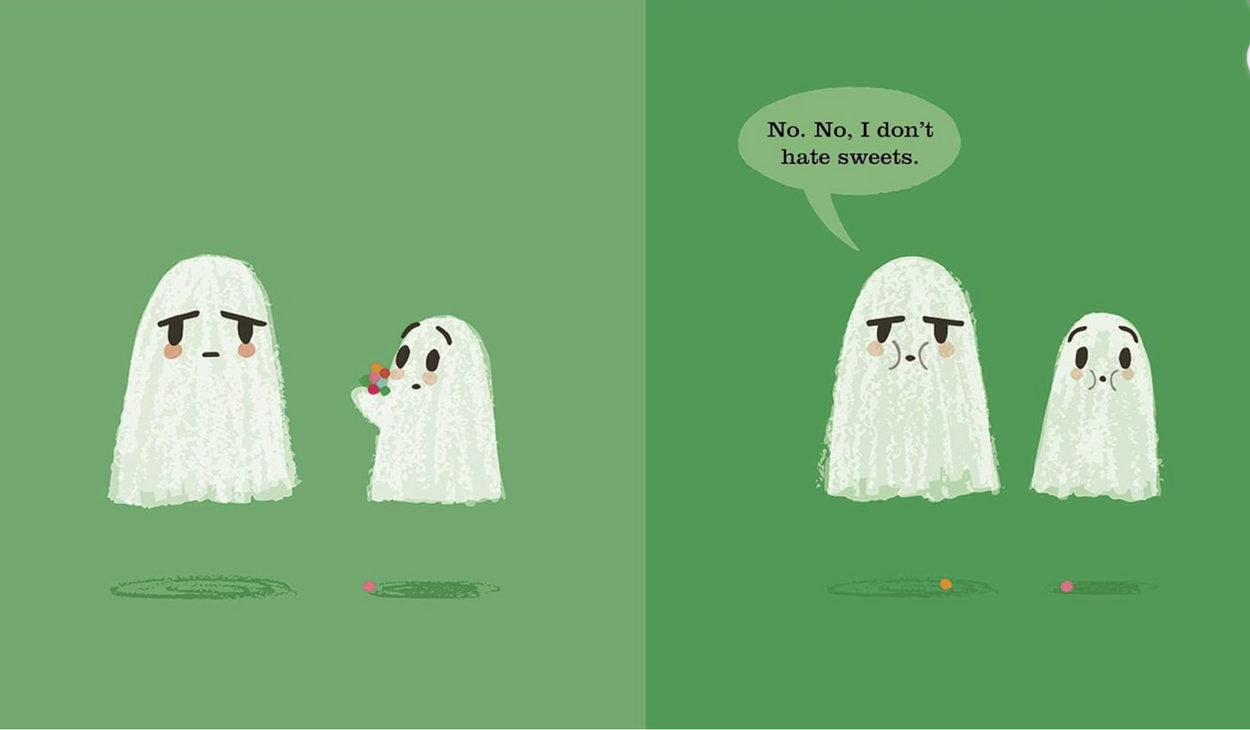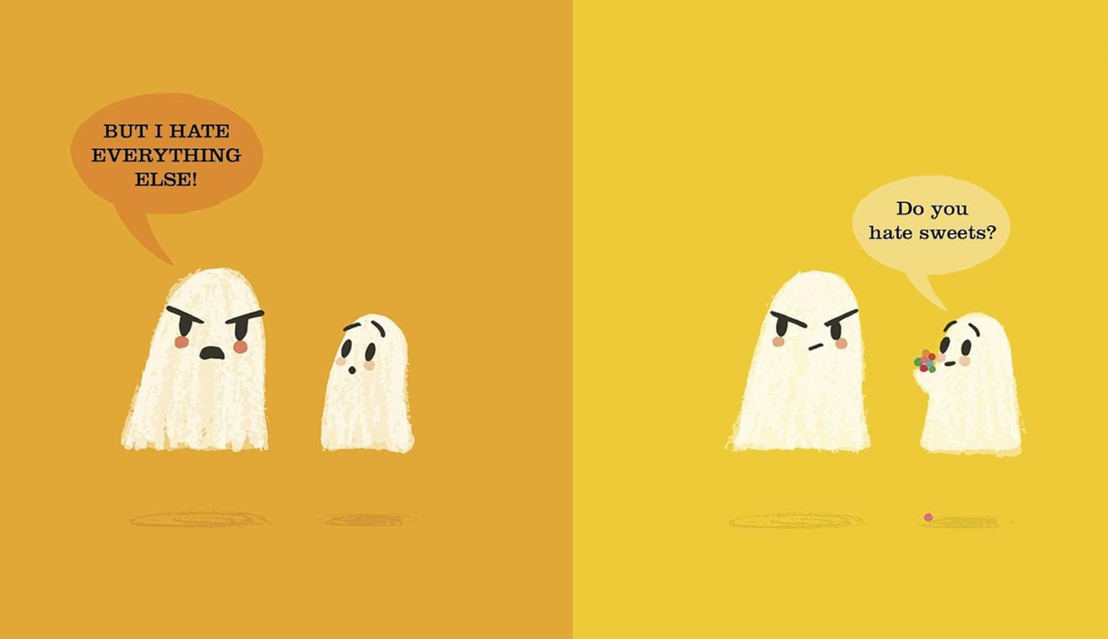A ghost is having a very bad day. He feels like he hates EVERYTHING! Lucky for him, he has a good ghost friend to talk it through with. Because if he doesn’t really hate sweets or flowers or dressing up, and he definitely doesn’t hate his friend, then maybe he doesn’t hate everything after all…