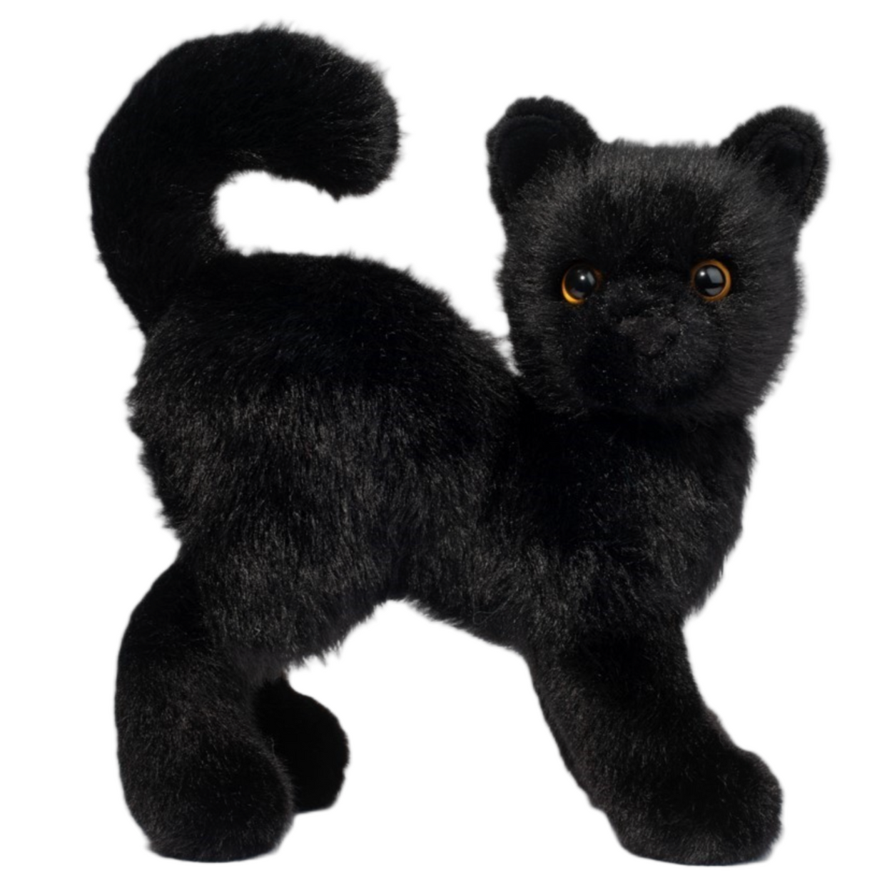 Scaredy the black cat brings good luck all year round! Whether you're looking for Halloween decor, the perfect companion for a little witch costume, or you just have a cat lover who needs to cuddle, adopt Scaredy today. This snuggly cat is ready for Fall adventures, featuring soft black fur, a curly tail, and stands at 7" tall, perfect for spooky season and beyond. Other plush friends sold separately.