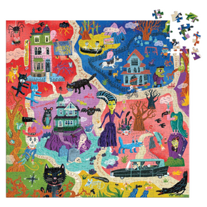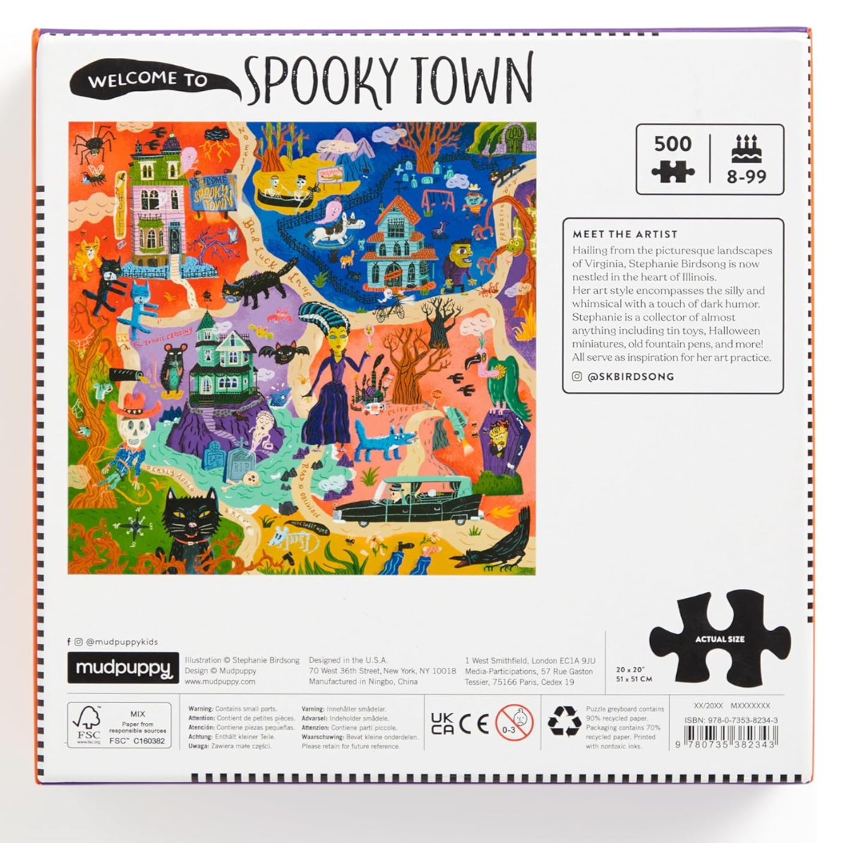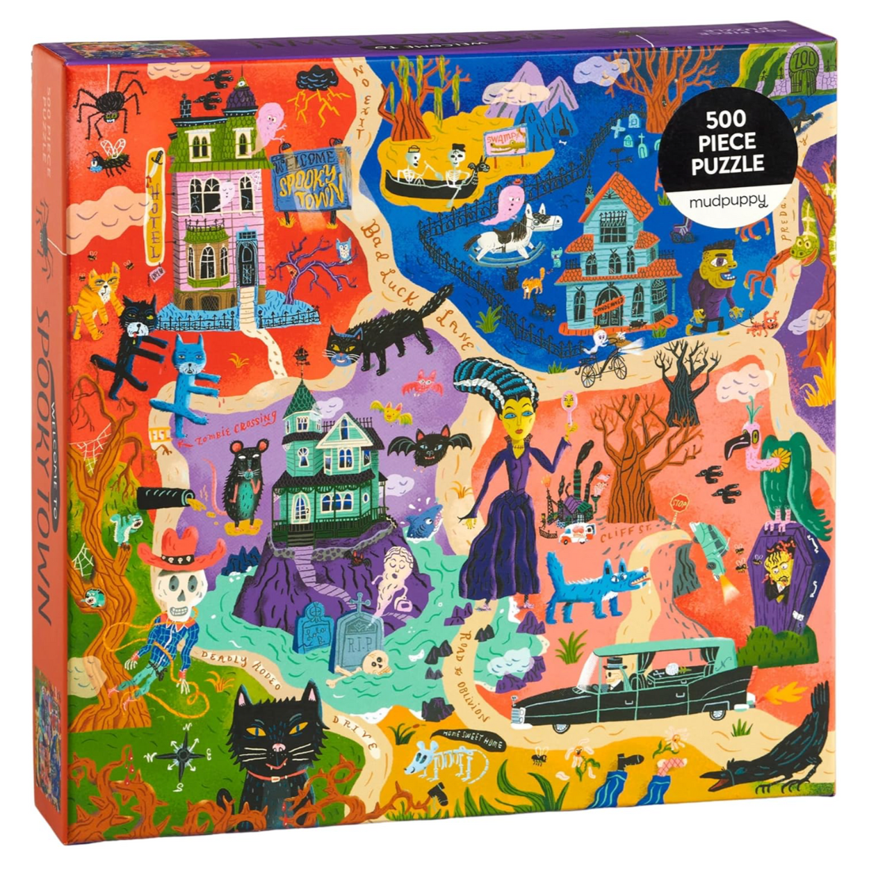 Welcome To Spooky Town 500 Piece Puzzle by Mudpuppy features a colorful and spooky illustration of a ghoulish town and all its fun monsters.