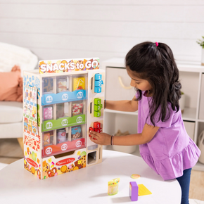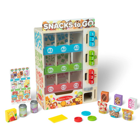 Satisfy hungry imaginations with the push of a button! Open up the back of the unique wooden vending machine and stock it with nine double-sided play food packages, including snack bars, drinks, and pouches. On the front, select an item, insert a color-matching play coin or bank card, press the corresponding letter and number button, and the snack drops into the collection drawer! No batteries required! There’s a sign that can be personalized and a reusable activity card for keeping track of what to stock and what to display. The vending machine measures 17 inches high x 12.5 inches wide x 5.5 inches deep, and requires no assembly. This vending play set is an engaging, hands-on way to help teach kids about cause-and-effect, and to encourage letter, number, and color recognition, sorting, matching, counting, and fine motor skills. All the pieces store in the vending machine for easy cleanup.