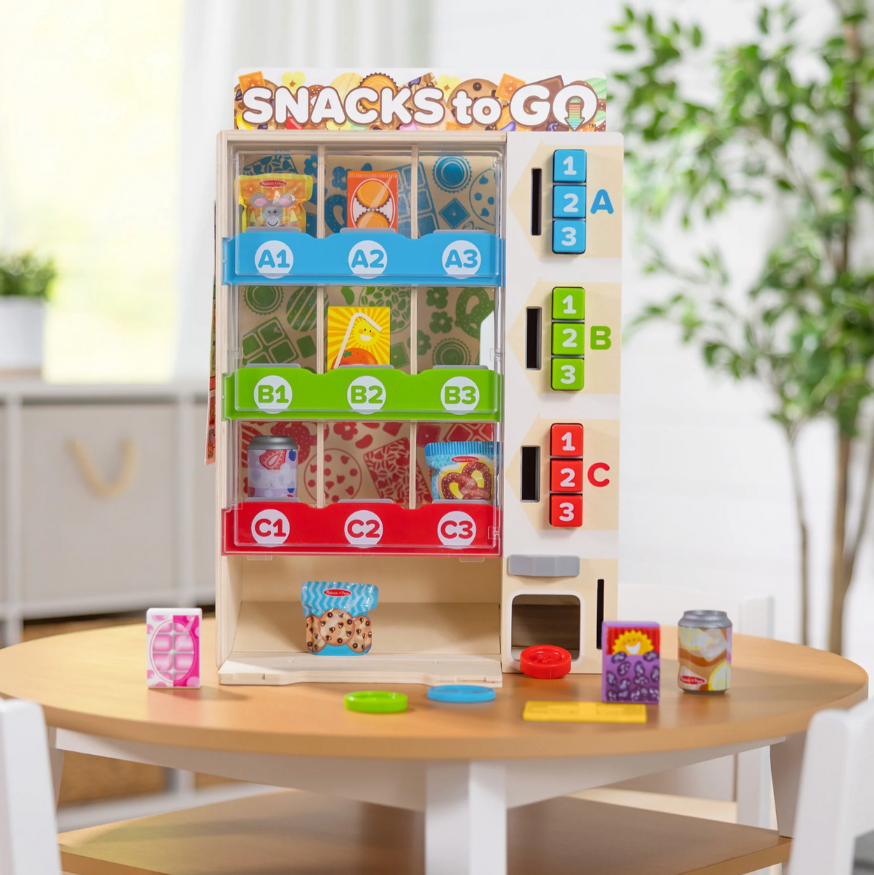 - Sort play food items, stock the wooden vending machine, then insert play coins and make a selection by pressing the corresponding button and watch items fall into the collection drawer