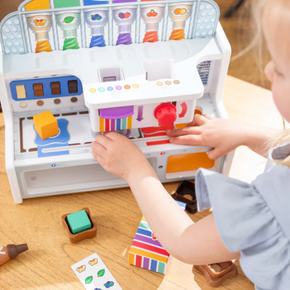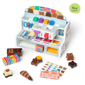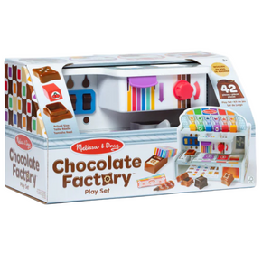 - Sweeten up playtime at the Melissa & Doug Wooden Chocolate Factory by mixing and matching pretend play candy shells, tops, and fillings; move the sliding conveyor, flip fidget switches, push a lever, turn a dial to make candies automatically drop into place