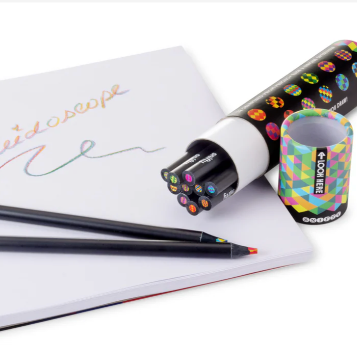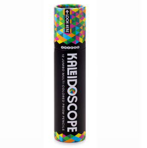 12 high-quality prism pencils. Each pencil features a unique multicolor patterned lead. The kaleidoscope-style tube with a clear cap, is just as eye-catching as what’s inside.