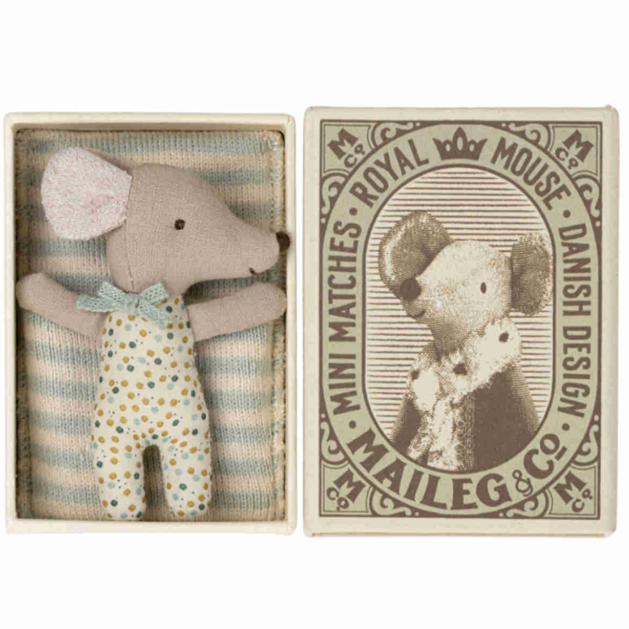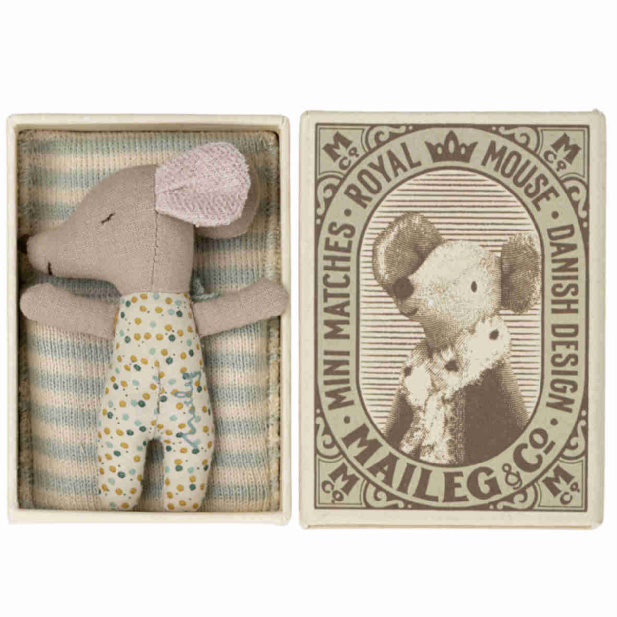 A classic Maileg item. This mouse is ready for hours of play and sleeps tight in the little matchbox. The clothes and bedlinen are made of soft fabrics with unique prints and beautiful colors.