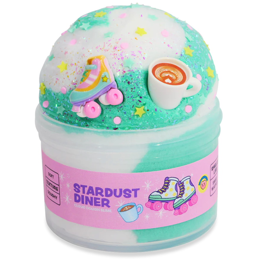 Cloud dough slime with a soft, doughy texture and sweet waffle scent. Slime comes with roller skate charm, latte charm, and diner themed sprinkle mix.