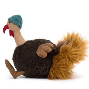 Theo Turkey may have plumage, but this turkey's taking no chances. He's knitted himself a bold teal hat, ready for the winter! Theo has over-sized honey feet, a round cocoa tummy and a silky ginger tail. Most impressive of all, this proud turkey has a beautiful suedette caruncle (that's the wobbly bit under his beak). A dazzling gift for happy holidays. Age 1+