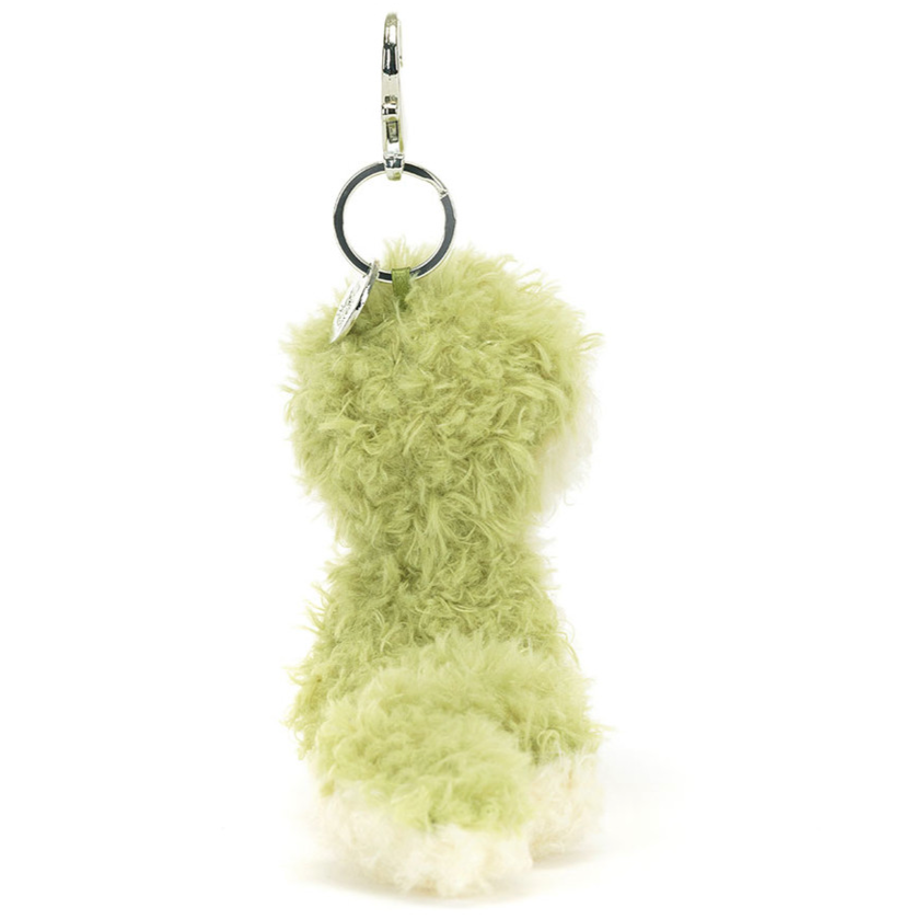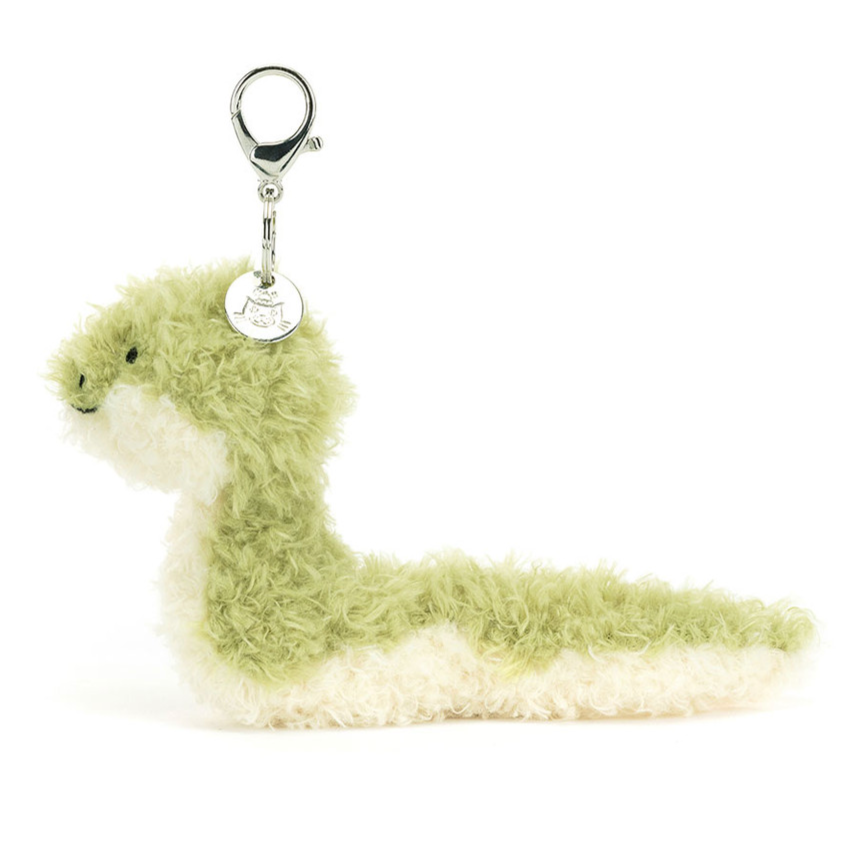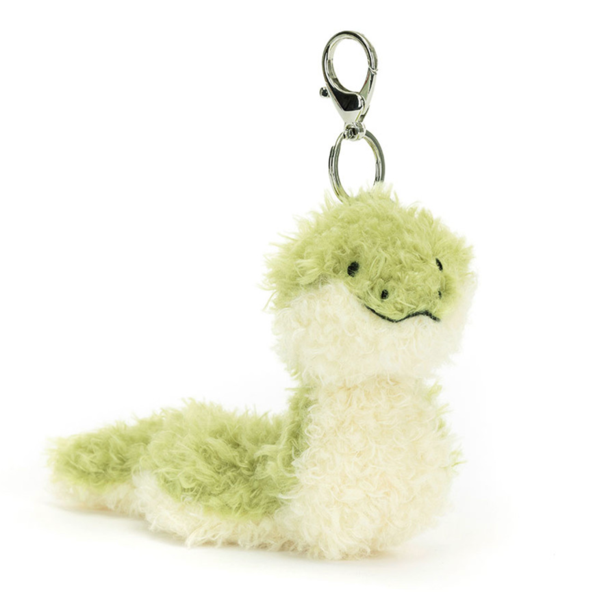 Little Snake Bag Charm is ready to slither along on every adventure. In tousled green and cream fur with embroidered facial features, this smiling serpent has a silver claw clip and Jellycat tag to attach to any bag for a ride-along reptile. Age +