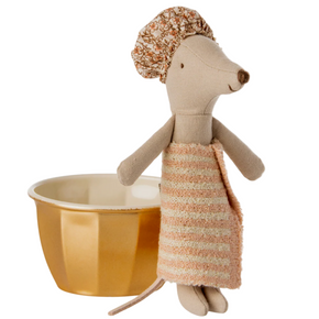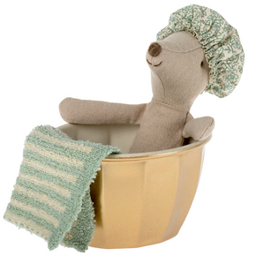 Rub a Dub Dub there is a mouse in the tub. Ms. Mouse gets squeaky clean in the tub, but her ears stay dry with her shower cap. She uses a cute gold metal cup for her tub. Every mouse needs a spa day!