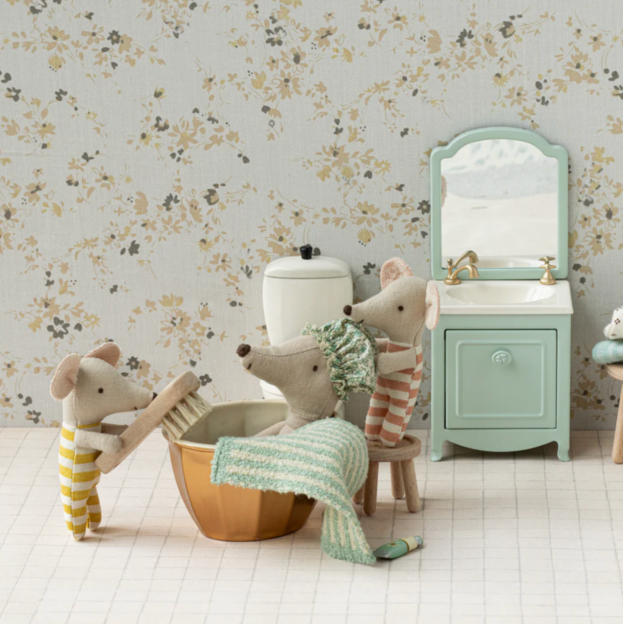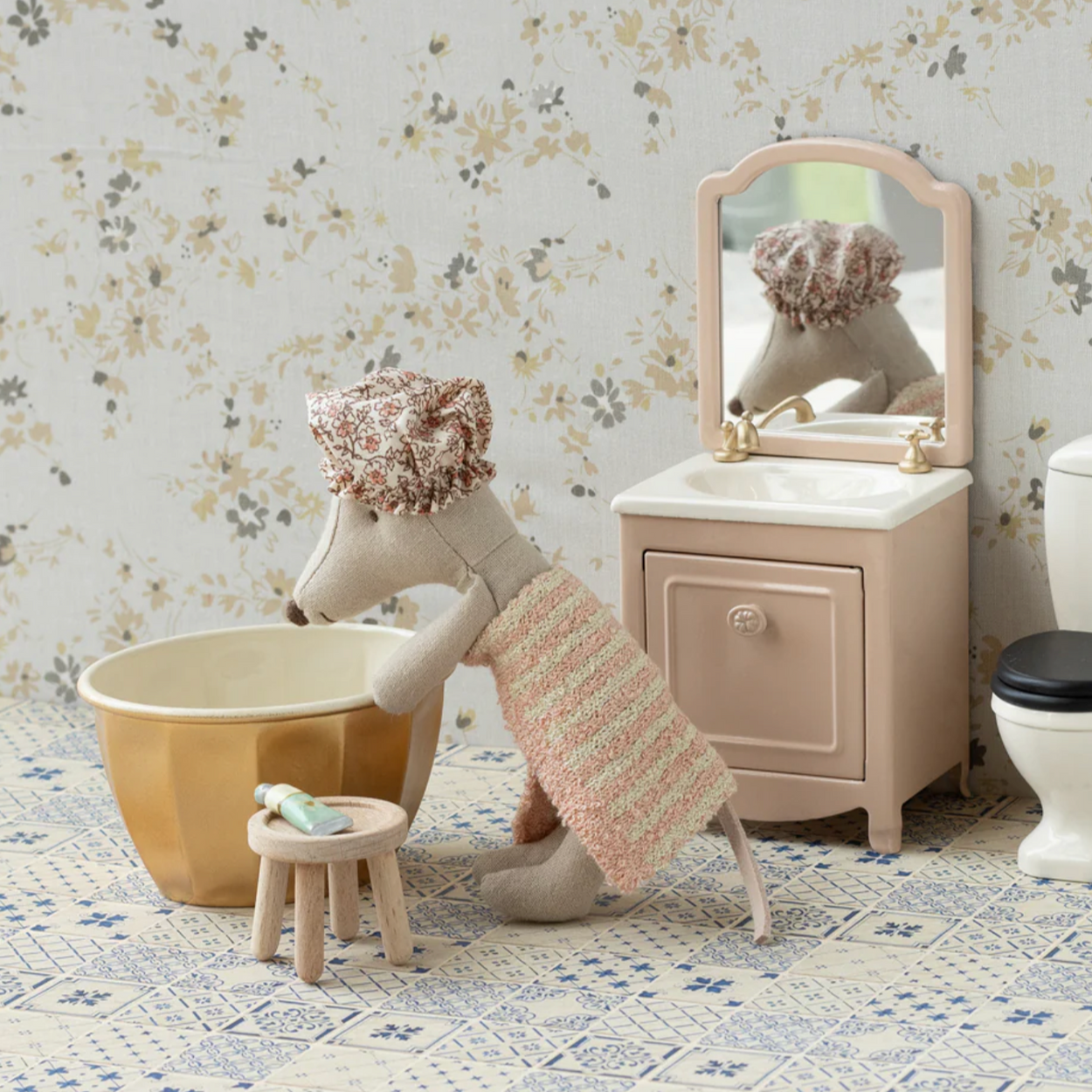 Like everyone else, this mouse loves to spend hours in the warm water in her lovely bathtub. This playset contains a golden metal bathtub, a big sister mouse, a shower cap, and a towel.