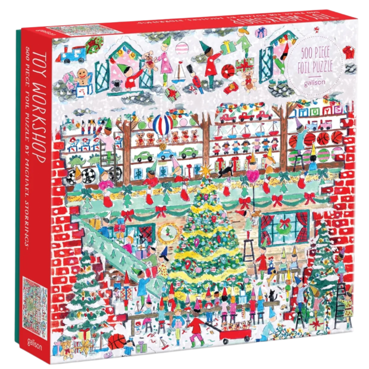 - 500 PIECE PUZZLE – Michael Storrings Toy Workshop 500 Piece Puzzle by Galison features the spirit of a toy workshop, embellished with frosty foil accents. This puzzle is just the right level of challenge for the whole family to join in on for hours of puzzling fun! The box includes an insert with the full puzzle image for reference.