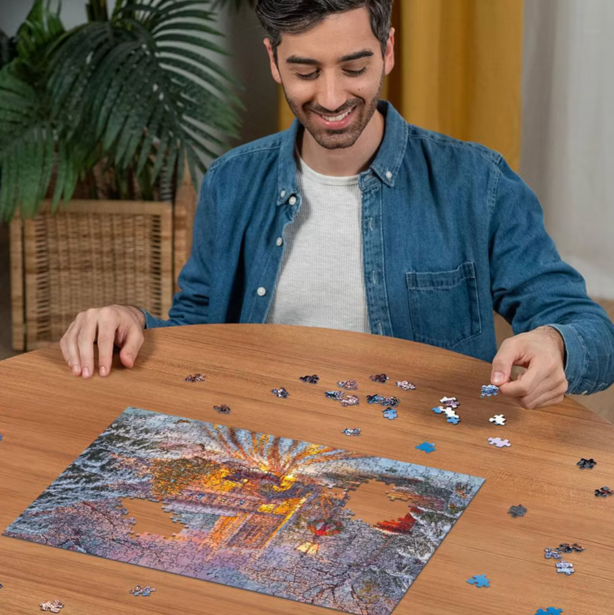 Give thanks for the gifts of the season and the time to unwind with our “Magical Christmas” 500-piece jigsaw puzzle! This serene scene captures the beauty of an old, stone church set in the English countryside. A bright red Penfold pillar letter box sits behind a wide bench where congregants may rest. The horse and buggy await their rider, who has slipped inside for quiet reflection. Just as the vibrant stained-glass windows glow, you’re sure to radiate joy as you complete this lovely scene!