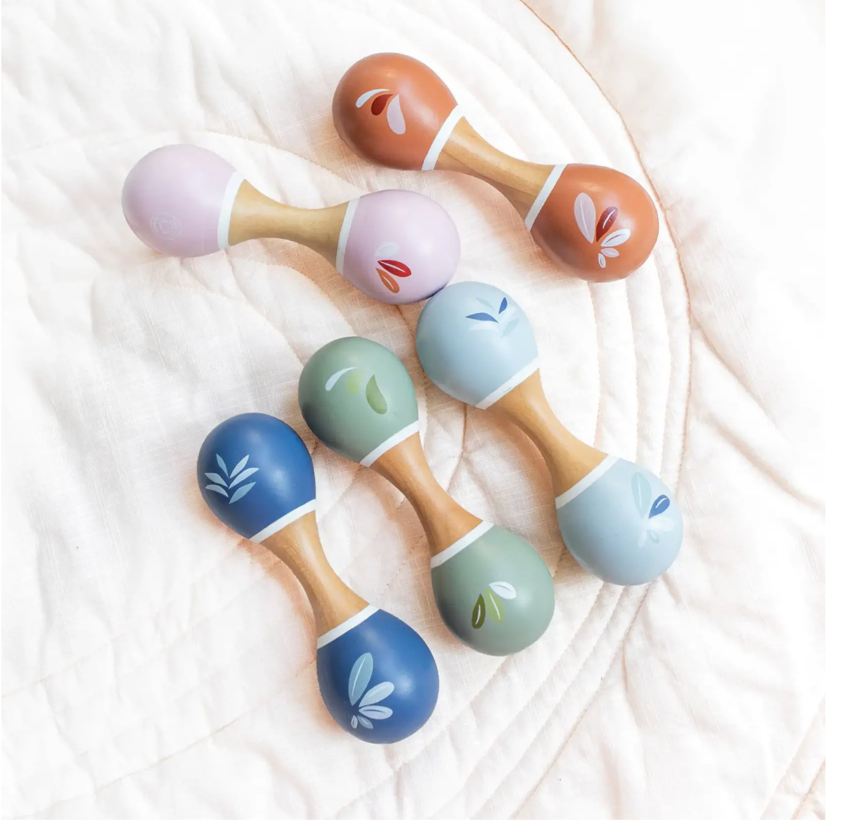 Beautifully crafted, these maracas are perfect for tiny hands and big rhythms. Whether they're creating their first band or shaking things up solo, our maraca promises musical merriment. This toy is crafted from sustainably sourced wood from FSC® certified forests and coated with non toxic, child-safe paint.