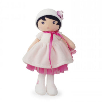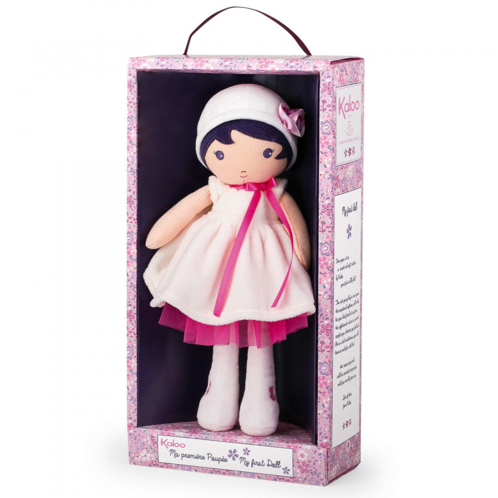 Perle K is all tenderness and elegance. The most gentle of the family, she is like a princess wearing a tulle skirt and pretty flower on the head. With her gentle smile and kind look, she will always be close to your little one to comfort her when she is sad. The iconic Kaloo bear is embroidered on her feet, making her even more unique. Write your daughter’s name on the long ribbon on the back of the doll to make her easily recognizable.