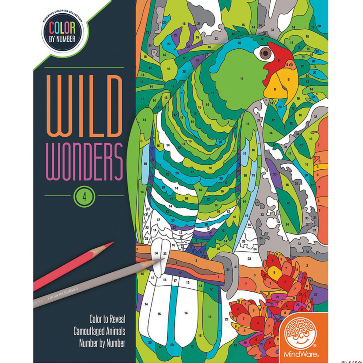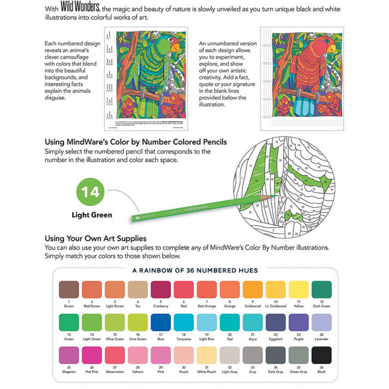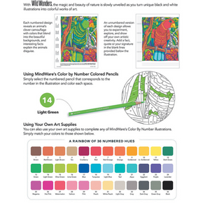 Take a walk on the wild side with this innovative coloring book featuring original, hand-drawn illustrations and MindWare's exclusive Color by Number system. As you follow the color codes using our corresponding colored pencils or your own art supplies, you'll marvel at the way some of Earth's magnificent creatures have developed an extraordinary ability to blend into their environment. An unnumbered version of each design awaits your unique personal style. Witness the subtle beauty of nature unfold before your eyes in this entertaining and relaxing coloring experience. Includes 22 images printed on thick, artist-quality paper with space to record your custom color palette for each unnumbered design.