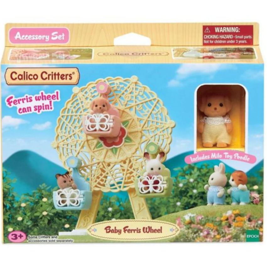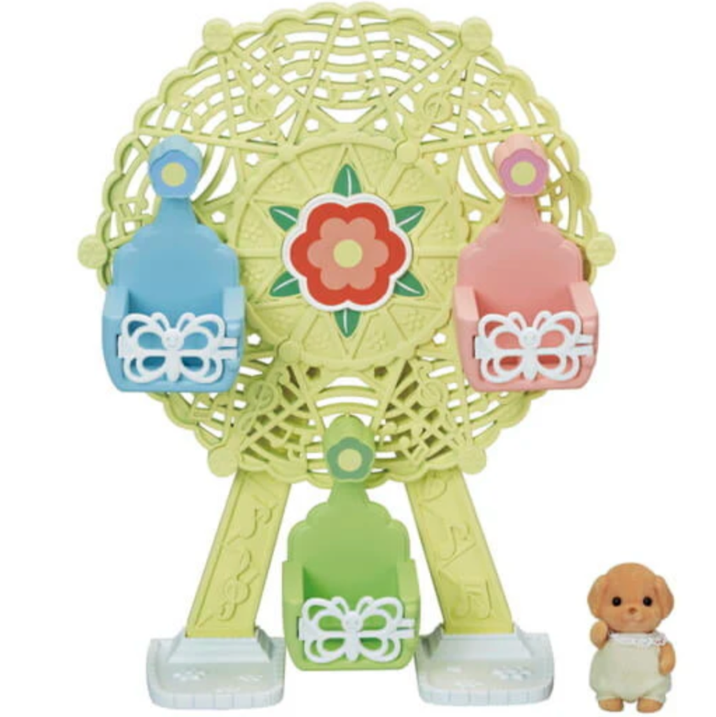 Baby Ferris Wheel includes a cute Ferris Wheel that can seat up to 3 babies and a toy Poodle baby figure.Baby Ferris wheel's Ferris Wheel can be turned by holding onto the handle and turning to spin the circular base.Can be placed on top of baby castle nursery (sold separately). have even more fun playing alongside baby airplane ride (sold separately).frame (left), frame (right), gondola x3, pole, center piece, lock piece, handle, base (left), base (right), toy Poodle baby (a total of 12 pieces). Suitable for children aged 3+.
