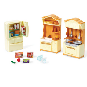 The Kitchen Play Set is the perfect furniture set for any Calico Critters home. It includes more than 30 detailed accessories including stove unit, sink unit, refrigerator, cooking utensils, vegetables, ice, pretend food cartons and more.