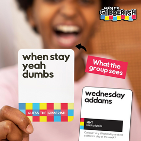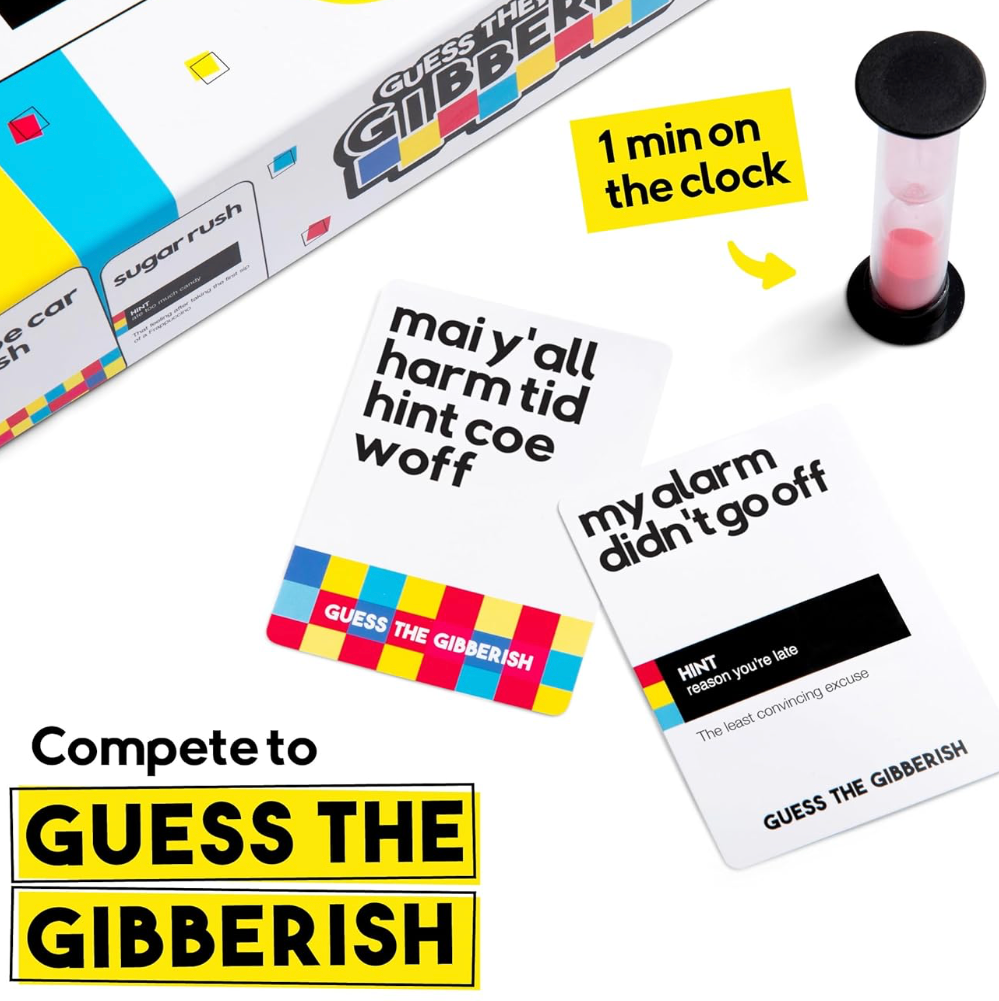 - How To Play: Flip the timer and hold up a card so that other players only see the gibberish side. Everyone else has to guess the phrase before time runs out. Decode the phrase first to win the point.