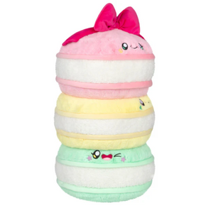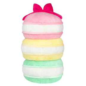 This pastel macaron stack is a sweet, cuddly pretend treat topped with a cute bow. Soft and huggable, it's perfect for all ages!