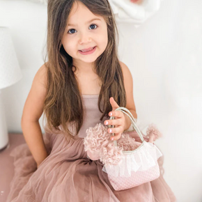 Tote around your pet bestie in their very own pretty toy purse! A miniature Paris the Poodle comes in a beautiful pink satin bag, trimmed in soft glitter tulle and gold handle.