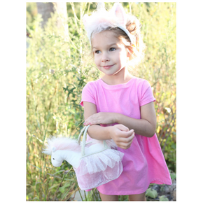 Tote around your pet bestie in their very own pretty toy purse! A pint sized Ophelia the Unicorn comes in a beautiful novel velour bag, trimmed in soft glitter tulle and gold handle.